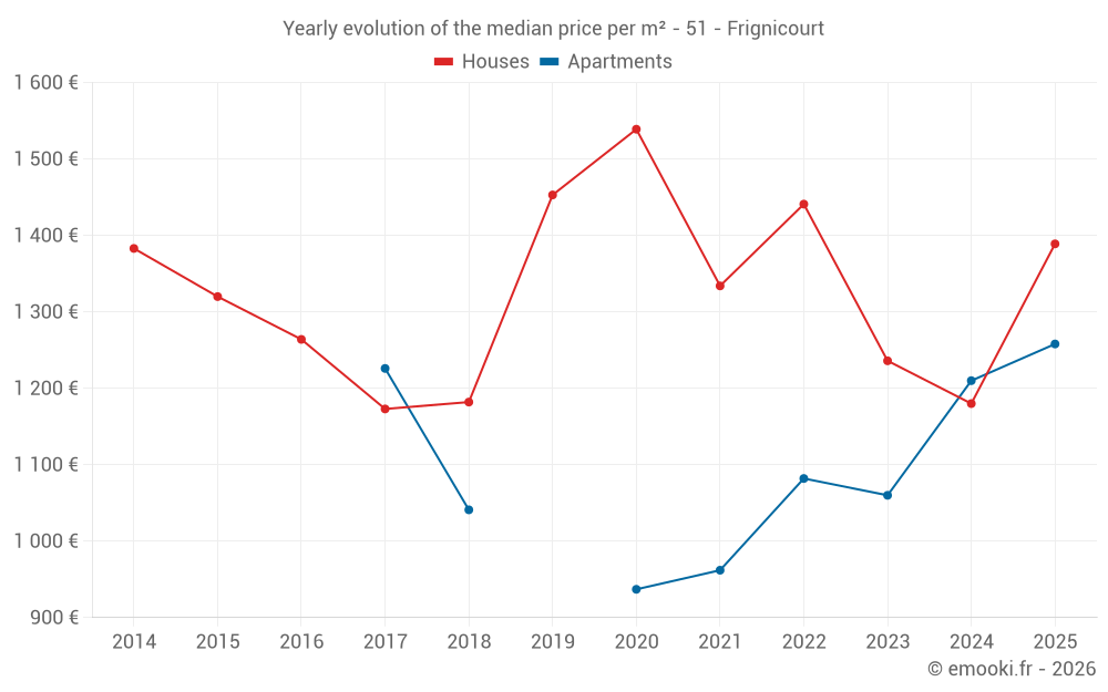 The median price on the 23 house transactions of the last 12 months in the municipality of Frignicourt was 1 198 € per square meter for a median property value of 86 010 €. Over this period, 60% of transactions were between 1 001 and 1 444 € per square meter (from the 2nd to the 8th deciles).