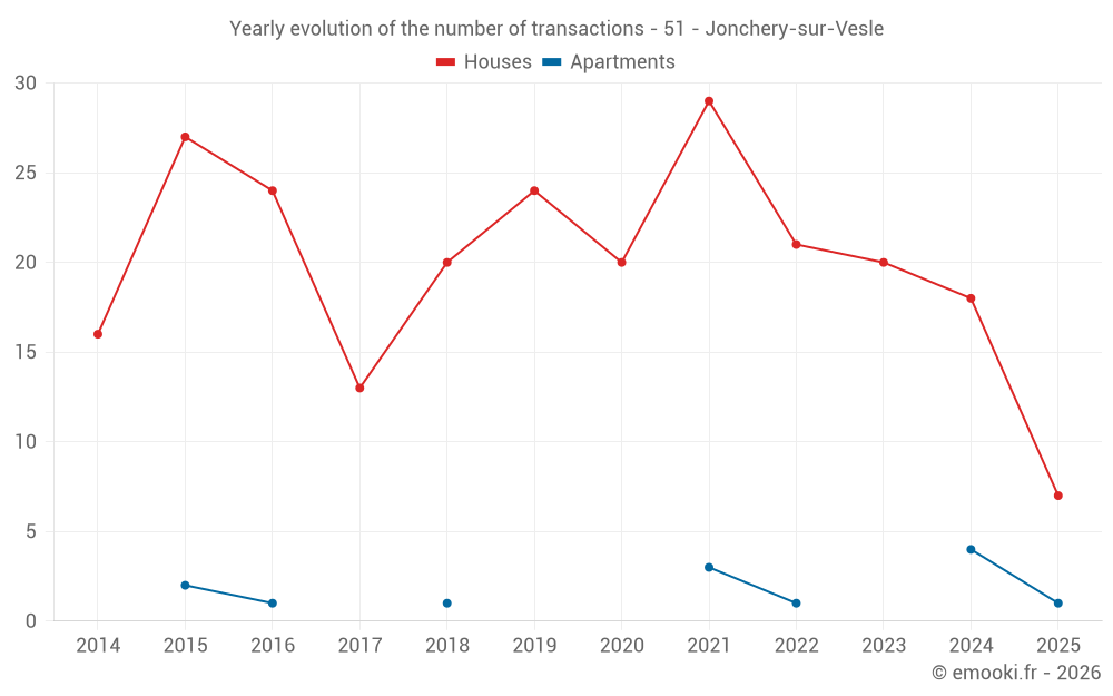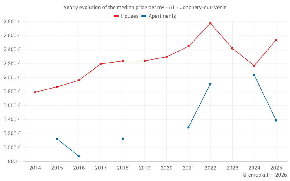 The median price on the 19 house transactions of the last 12 months in the municipality of Jonchery-sur-Vesle was 2 258 € per square meter for a median property value of 234 200 €. Over this period, 60% of transactions were between 2 010 and 2 814 € per square meter (from the 2nd to the 8th deciles).