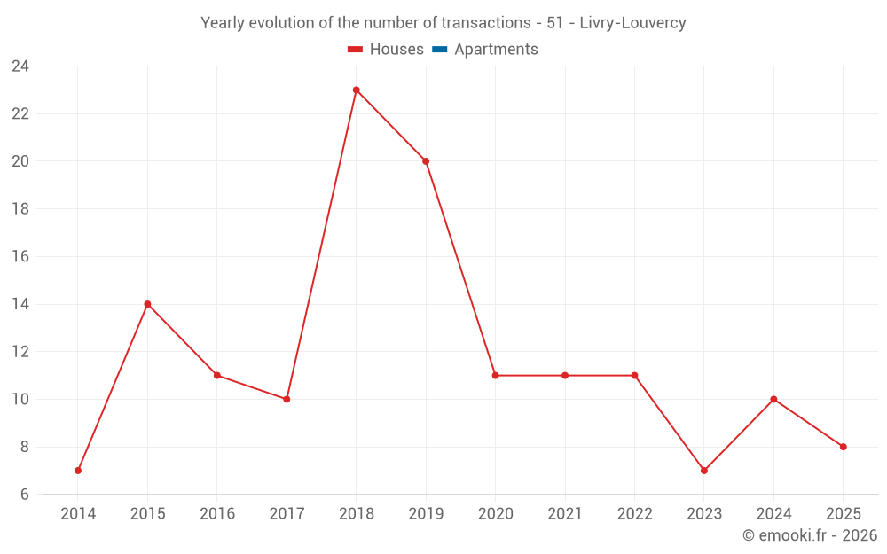 The median price on the 21 house transactions of the last 24 months in the municipality of Livry-Louvercy was 2 155 € per square meter for a median property value of 219 000 €. Over this period, 60% of transactions were between 1 757 and 2 385 € per square meter (from the 2nd to the 8th deciles).