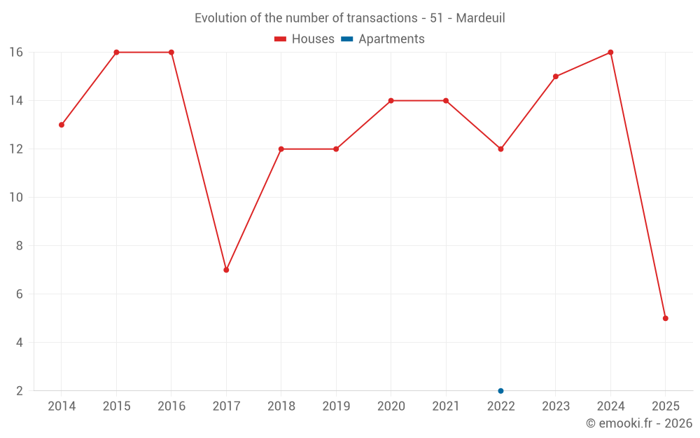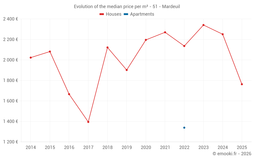 The median price on the 31 house transactions of the last 24 months in the municipality of Mardeuil was 2 159 € per square meter for a median property value of 198 500 €. Over this period, 60% of transactions were between 1 406 and 2 647 € per square meter (from the 2nd to the 8th deciles).