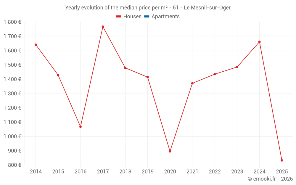 The median price on the 24 house transactions of the last 24 months in the municipality of Le Mesnil-sur-Oger was 1 290 € per square meter for a median property value of 157 050 €. Over this period, 60% of transactions were between 847 and 1 998 € per square meter (from the 2nd to the 8th deciles).