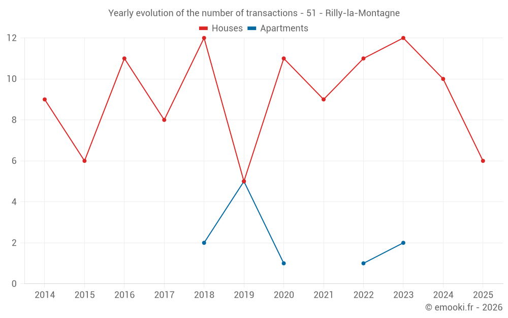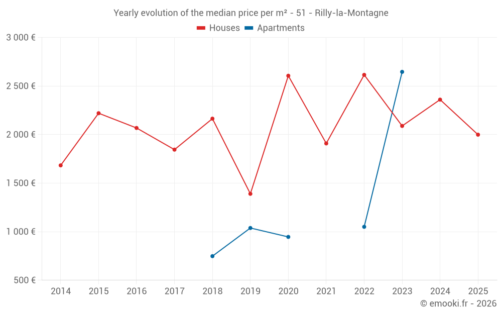 The median price on the 24 house transactions of the last 24 months in the municipality of Rilly-la-Montagne was 2 214 € per square meter for a median property value of 239 500 €. Over this period, 60% of transactions were between 1 608 and 3 035 € per square meter (from the 2nd to the 8th deciles).