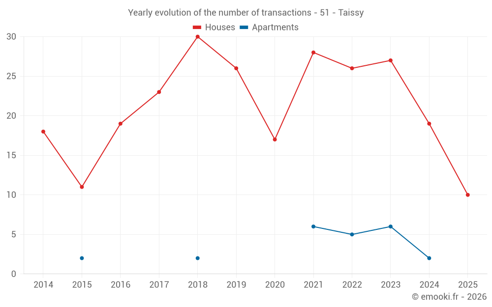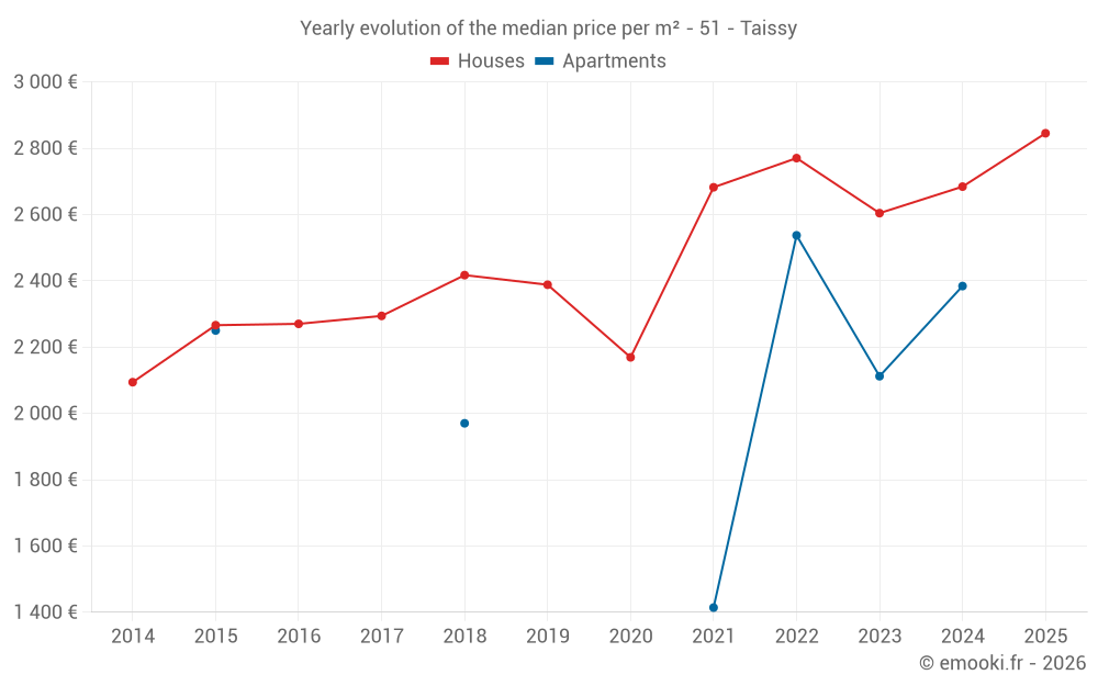 The median price on the 19 house transactions of the last 12 months in the municipality of Taissy was 2 778 € per square meter for a median property value of 252 000 €. Over this period, 60% of transactions were between 2 404 and 3 355 € per square meter (from the 2nd to the 8th deciles).