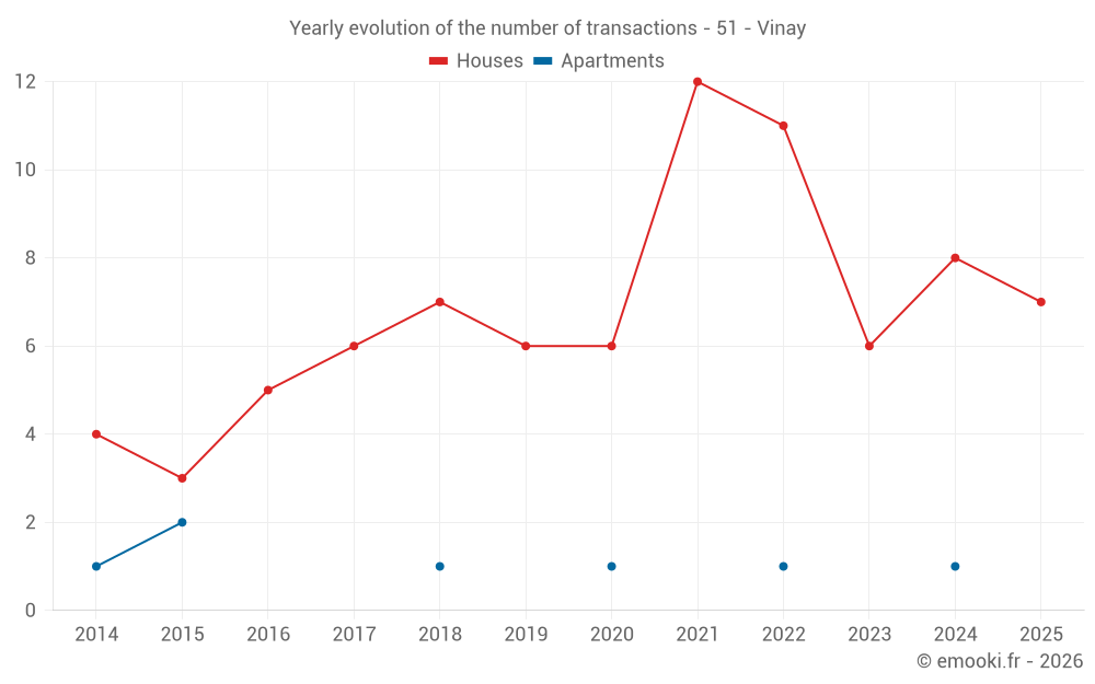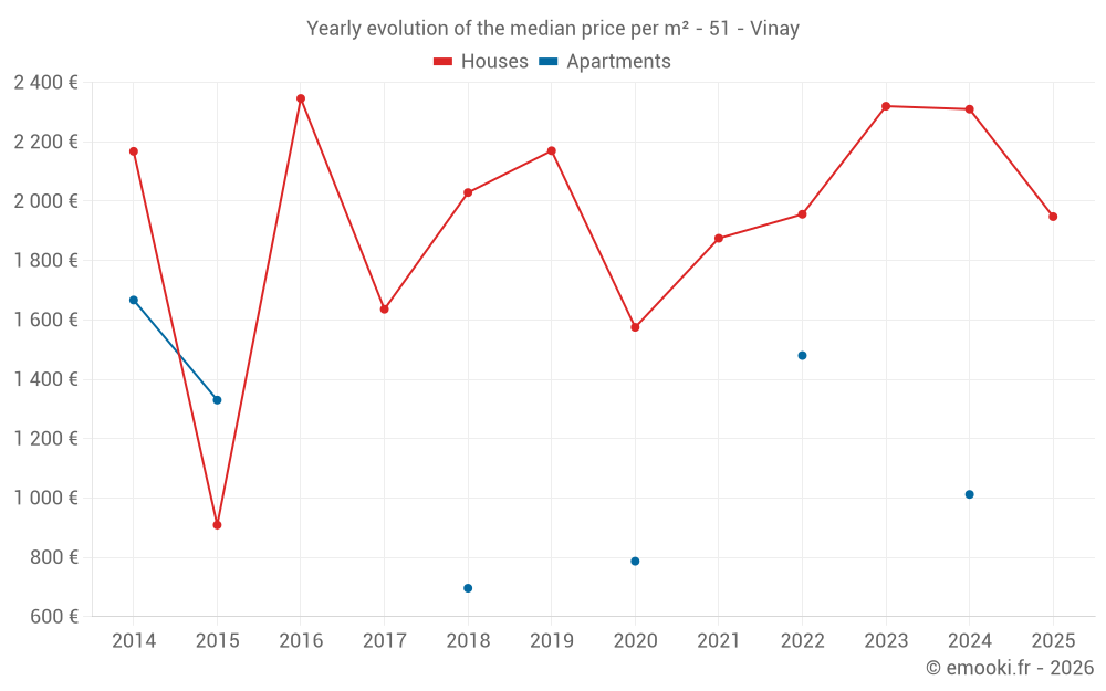 The median price on the 15 house transactions of the last 24 months in the municipality of Vinay was 2 091 € per square meter for a median property value of 164 000 €. Over this period, 60% of transactions were between 1 226 and 2 745 € per square meter (from the 2nd to the 8th deciles).