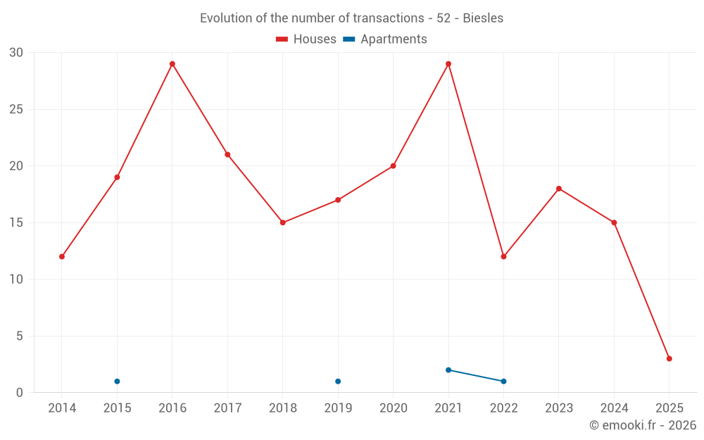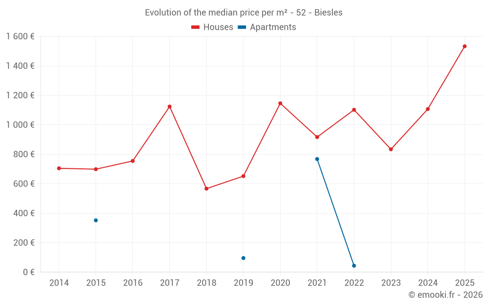 The median price on the 27 house transactions of the last 24 months in the municipality of Biesles was 1 118 € per square meter for a median property value of 95 000 €. Over this period, 60% of transactions were between 554 and 1 699 € per square meter (from the 2nd to the 8th deciles).