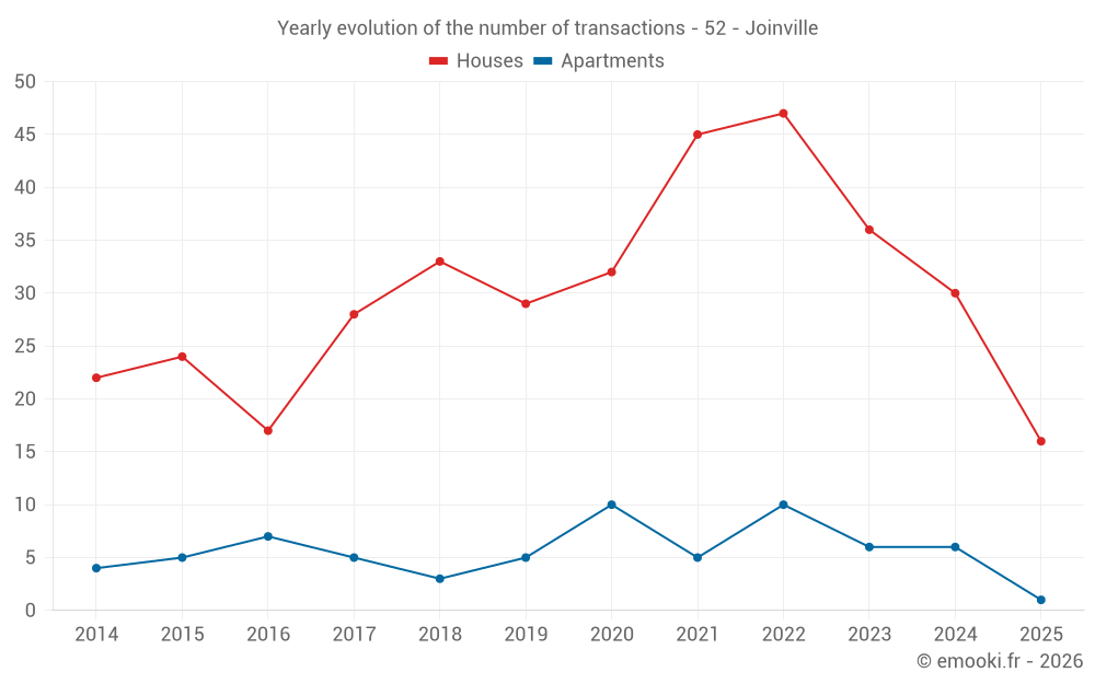 The median price on the 30 house transactions of the last 12 months in the municipality of Joinville was 668 € per square meter for a median property value of 71 500 €. Over this period, 60% of transactions were between 511 and 1 344 € per square meter (from the 2nd to the 8th deciles).