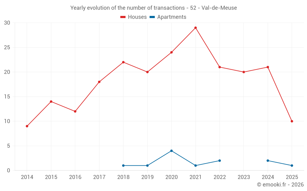 The median price on the 19 house transactions of the last 12 months in the municipality of Val-de-Meuse was 800 € per square meter for a median property value of 83 500 €. Over this period, 60% of transactions were between 287 and 1 201 € per square meter (from the 2nd to the 8th deciles).