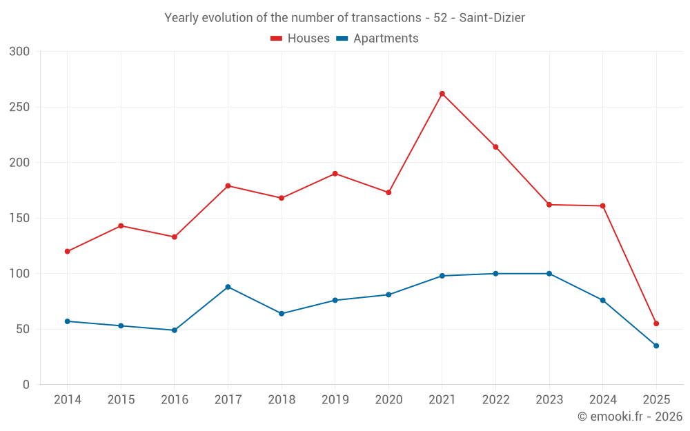 The median price on the 24 house transactions of the last 3 months in the municipality of Saint-Dizier was 1 156 € per square meter for a median property value of 104 850 €. Over this period, 60% of transactions were between 867 and 1 521 € per square meter (from the 2nd to the 8th deciles).