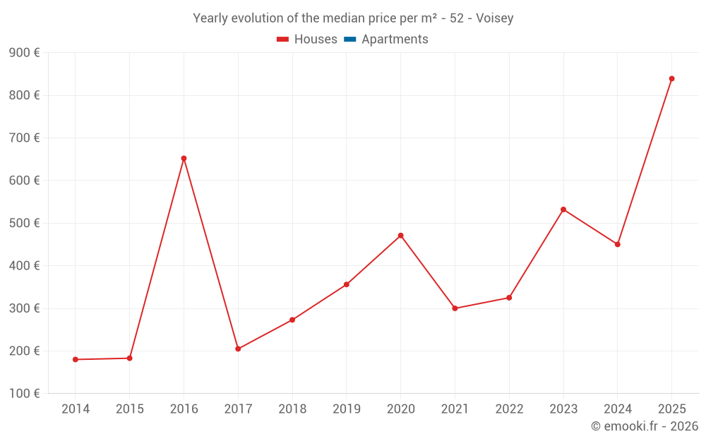 The median price on the 15 house transactions of the last 24 months in the municipality of Voisey was 424 € per square meter for a median property value of 50 000 €. Over this period, 60% of transactions were between 222 and 1 461 € per square meter (from the 2nd to the 8th deciles).