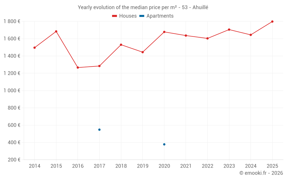 The median price on the 21 house transactions of the last 12 months in the municipality of Ahuillé was 1 880 € per square meter for a median property value of 215 000 €. Over this period, 60% of transactions were between 1 611 and 2 330 € per square meter (from the 2nd to the 8th deciles).