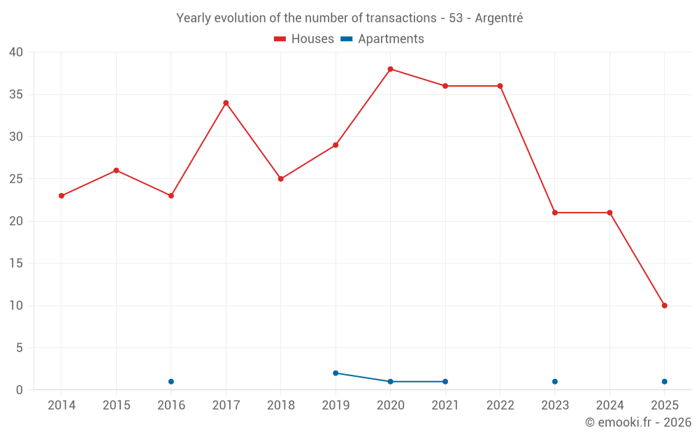 The median price on the 22 house transactions of the last 12 months in the municipality of Argentré was 1 558 € per square meter for a median property value of 172 500 €. Over this period, 60% of transactions were between 1 002 and 2 095 € per square meter (from the 2nd to the 8th deciles).