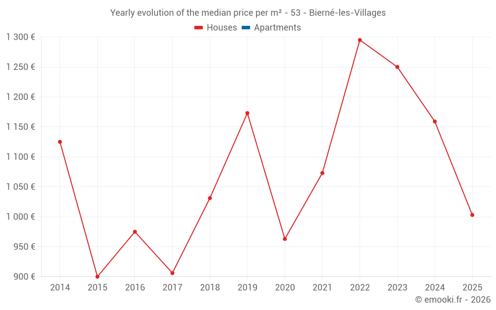 The median price on the 28 house transactions of the last 24 months in the municipality of Bierné-les-Villages was 1 152 € per square meter for a median property value of 101 000 €. Over this period, 60% of transactions were between 594 and 1 510 € per square meter (from the 2nd to the 8th deciles).
