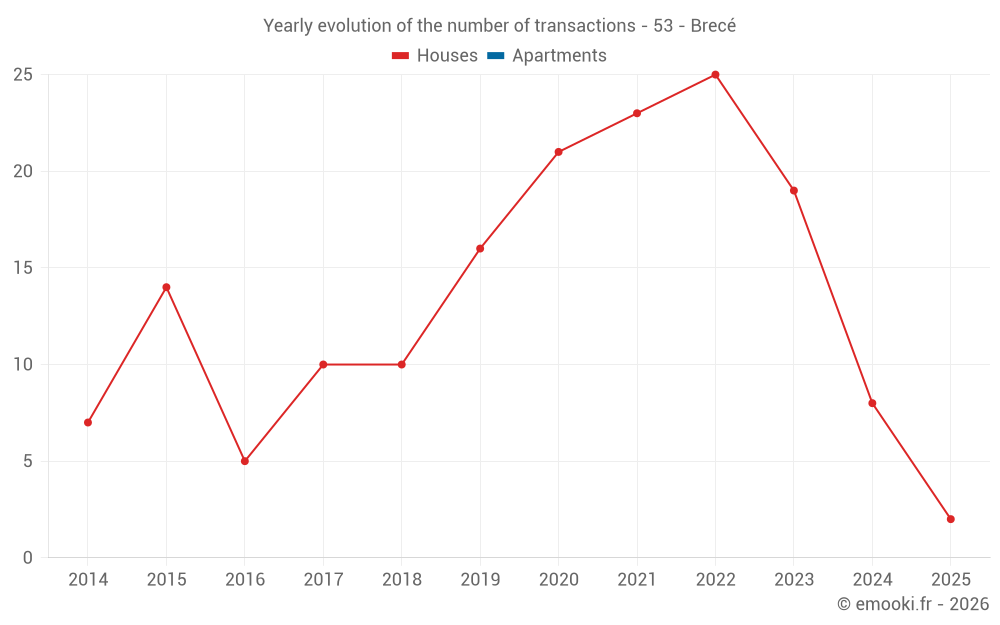 The median price on the 22 house transactions of the last 24 months in the municipality of Brecé was 1 010 € per square meter for a median property value of 90 000 €. Over this period, 60% of transactions were between 590 and 1 579 € per square meter (from the 2nd to the 8th deciles).