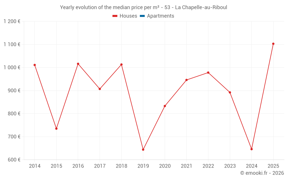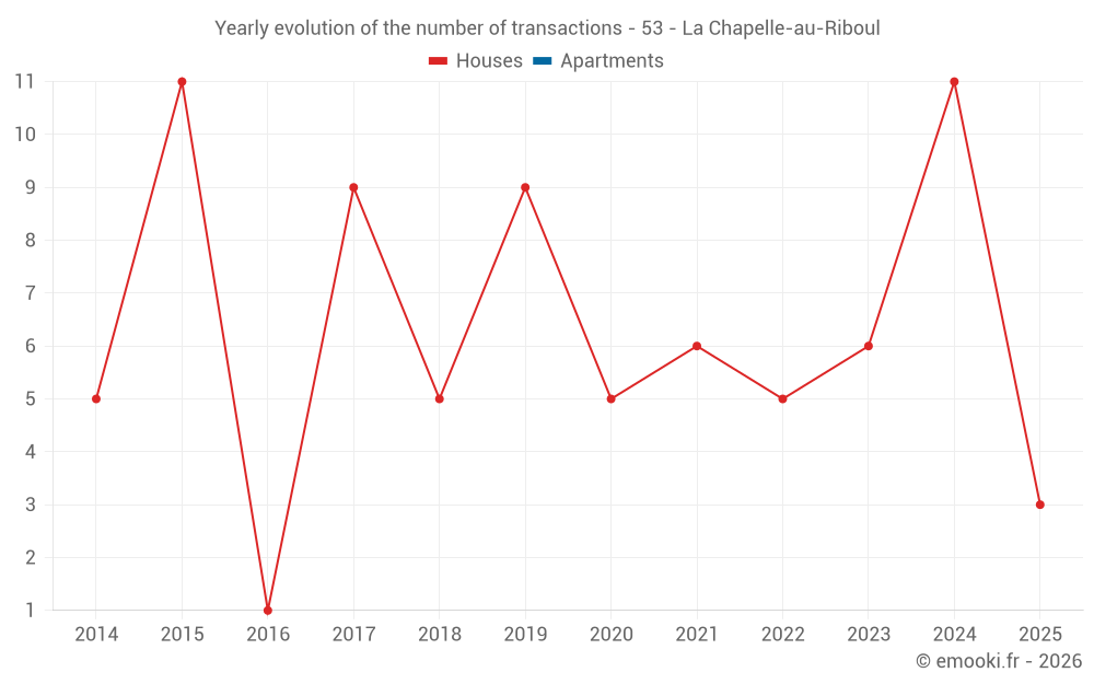 The median price on the 17 house transactions of the last 24 months in the municipality of La Chapelle-au-Riboul was 763 € per square meter for a median property value of 81 000 €. Over this period, 60% of transactions were between 447 and 1 274 € per square meter (from the 2nd to the 8th deciles).