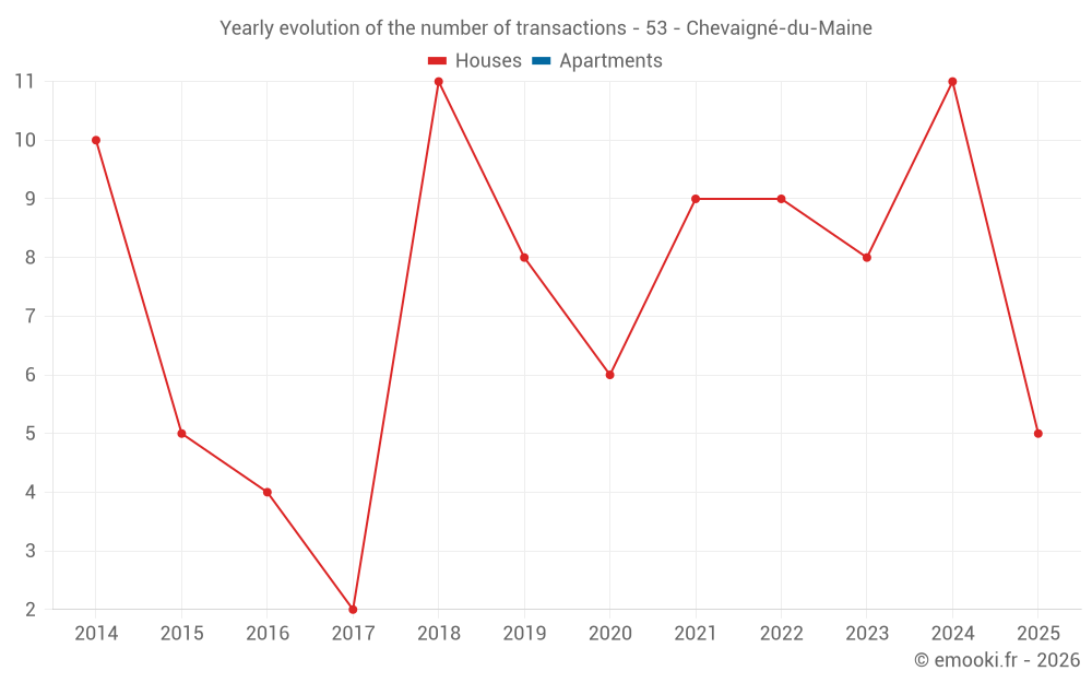 The median price on the 20 house transactions of the last 24 months in the municipality of Chevaigné-du-Maine was 908 € per square meter for a median property value of 64 250 €. Over this period, 60% of transactions were between 638 and 1 116 € per square meter (from the 2nd to the 8th deciles).