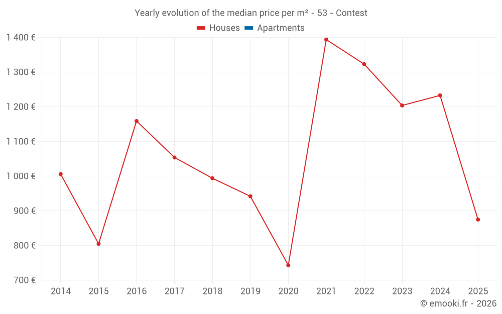 The median price on the 14 house transactions of the last 24 months in the municipality of Contest was 1 209 € per square meter for a median property value of 78 000 €. Over this period, 60% of transactions were between 769 and 1 339 € per square meter (from the 2nd to the 8th deciles).
