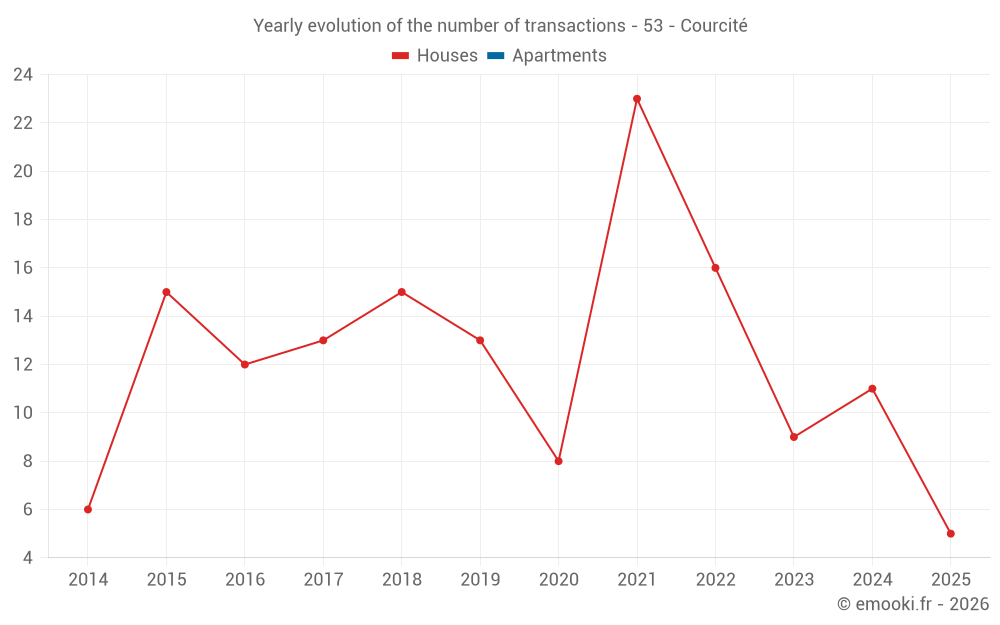 The median price on the 21 house transactions of the last 24 months in the municipality of Courcité was 833 € per square meter for a median property value of 95 000 €. Over this period, 60% of transactions were between 300 and 1 385 € per square meter (from the 2nd to the 8th deciles).