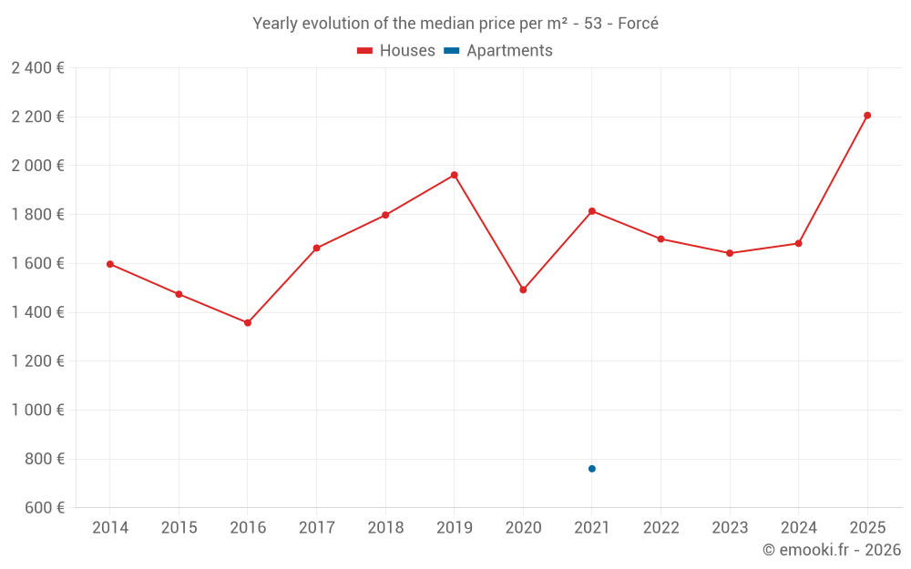 The median price on the 22 house transactions of the last 24 months in the municipality of Forcé was 1 654 € per square meter for a median property value of 177 195 €. Over this period, 60% of transactions were between 1 097 and 2 077 € per square meter (from the 2nd to the 8th deciles).
