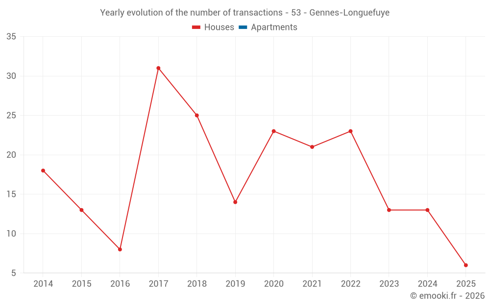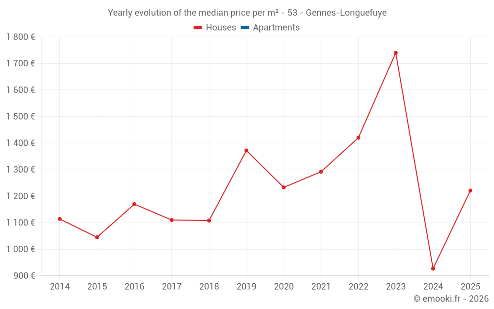 The median price on the 25 house transactions of the last 24 months in the municipality of Gennes-Longuefuye was 1 300 € per square meter for a median property value of 131 500 €. Over this period, 60% of transactions were between 879 and 1 807 € per square meter (from the 2nd to the 8th deciles).