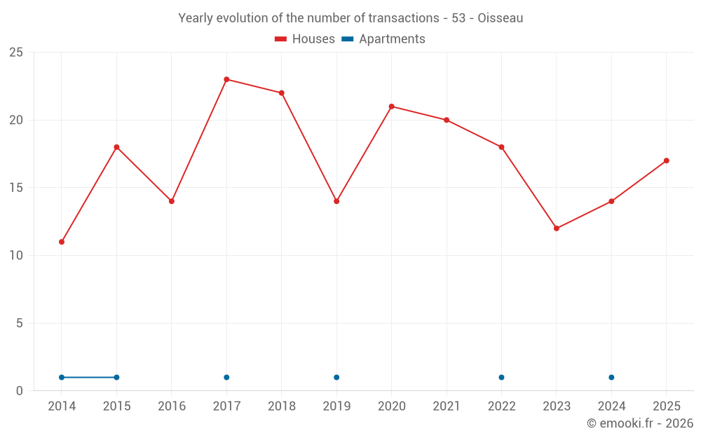 The median price on the 17 house transactions of the last 12 months in the municipality of Oisseau was 938 € per square meter for a median property value of 100 000 €. Over this period, 60% of transactions were between 436 and 1 348 € per square meter (from the 2nd to the 8th deciles).