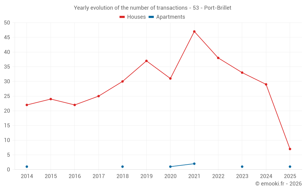 The median price on the 22 house transactions of the last 12 months in the municipality of Port-Brillet was 1 480 € per square meter for a median property value of 119 900 €. Over this period, 60% of transactions were between 1 150 and 1 818 € per square meter (from the 2nd to the 8th deciles).