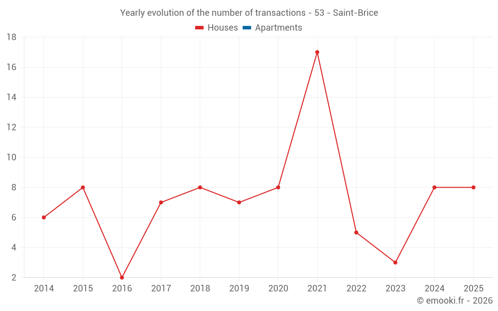 The median price on the 18 house transactions of the last 24 months in the municipality of Saint-Brice was 1 410 € per square meter for a median property value of 93 245 €. Over this period, 60% of transactions were between 733 and 1 912 € per square meter (from the 2nd to the 8th deciles).