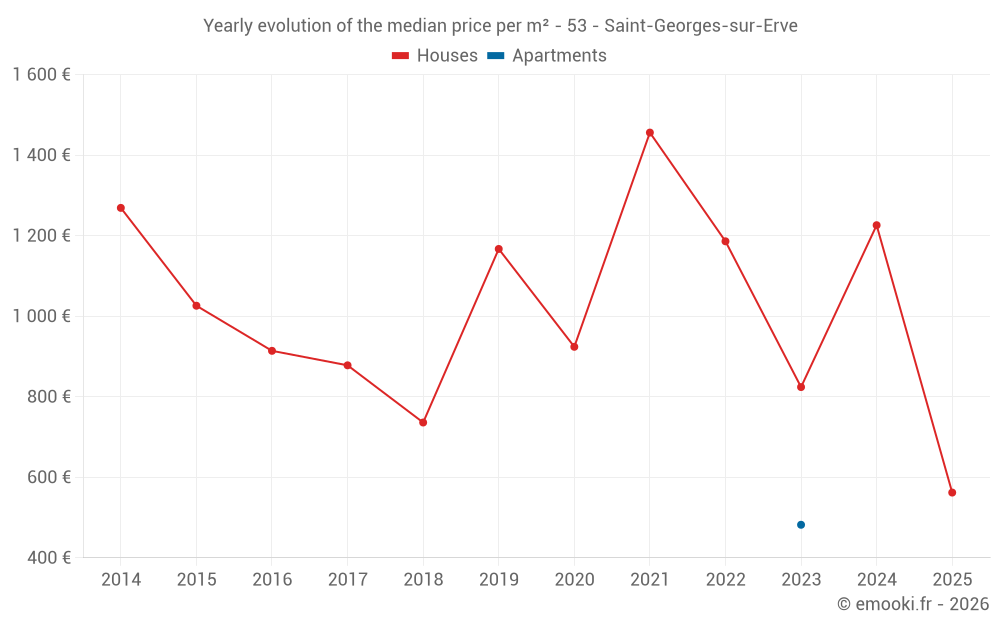The median price on the 17 house transactions of the last 24 months in the municipality of Saint-Georges-sur-Erve was 952 € per square meter for a median property value of 62 000 €. Over this period, 60% of transactions were between 664 and 1 367 € per square meter (from the 2nd to the 8th deciles).