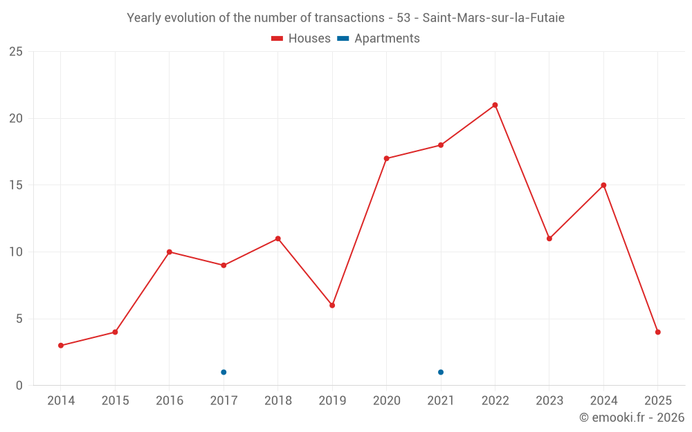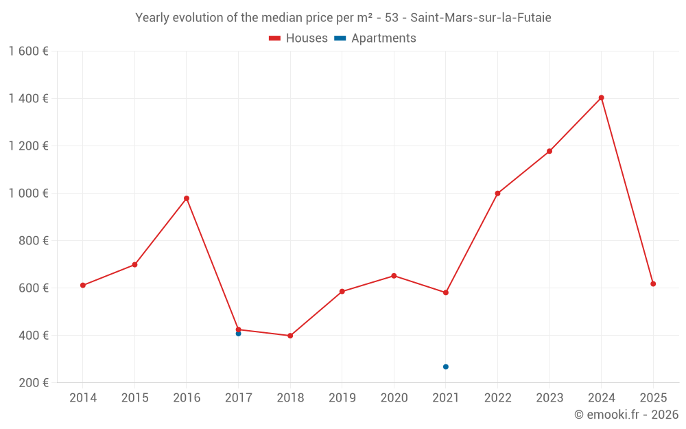 The median price on the 27 house transactions of the last 24 months in the municipality of Saint-Mars-sur-la-Futaie was 1 243 € per square meter for a median property value of 92 100 €. Over this period, 60% of transactions were between 750 and 1 588 € per square meter (from the 2nd to the 8th deciles).
