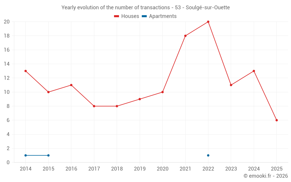 The median price on the 22 house transactions of the last 24 months in the municipality of Soulgé-sur-Ouette was 1 332 € per square meter for a median property value of 145 250 €. Over this period, 60% of transactions were between 1 045 and 1 892 € per square meter (from the 2nd to the 8th deciles).