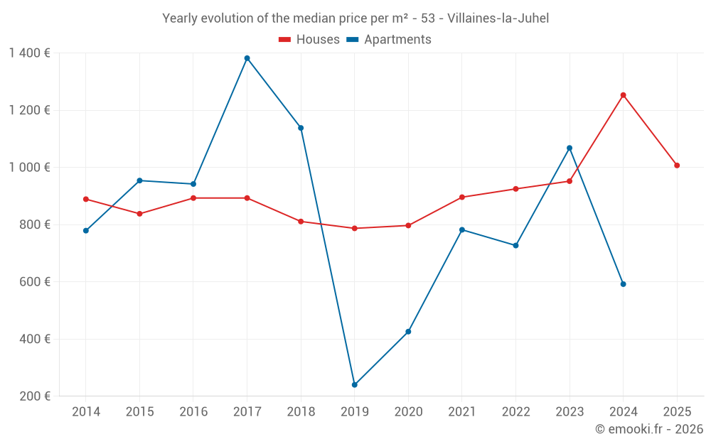 The median price on the 30 house transactions of the last 12 months in the municipality of Villaines-la-Juhel was 1 012 € per square meter for a median property value of 88 500 €. Over this period, 60% of transactions were between 533 and 1 367 € per square meter (from the 2nd to the 8th deciles).