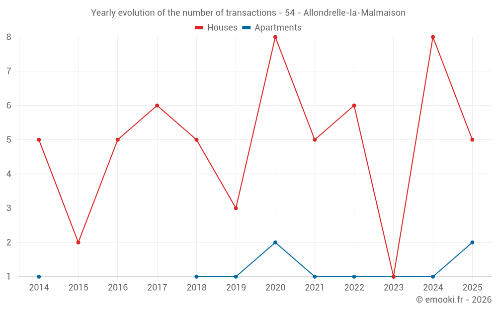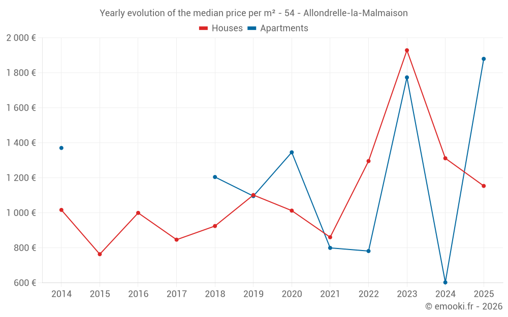 The median price on the 14 house transactions of the last 24 months in the municipality of Allondrelle-la-Malmaison was 1 277 € per square meter for a median property value of 148 750 €. Over this period, 60% of transactions were between 898 and 2 003 € per square meter (from the 2nd to the 8th deciles).