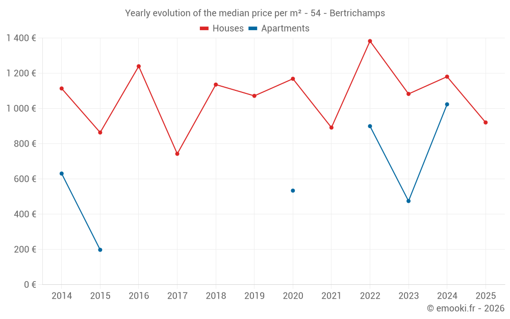 The median price on the 29 house transactions of the last 24 months in the municipality of Bertrichamps was 1 052 € per square meter for a median property value of 131 200 €. Over this period, 60% of transactions were between 738 and 1 822 € per square meter (from the 2nd to the 8th deciles).