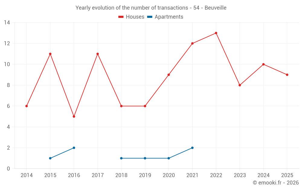 The median price on the 19 house transactions of the last 24 months in the municipality of Beuveille was 2 108 € per square meter for a median property value of 170 000 €. Over this period, 60% of transactions were between 1 281 and 2 364 € per square meter (from the 2nd to the 8th deciles).