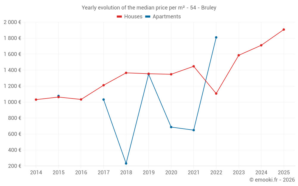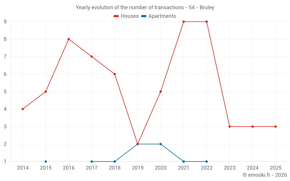 Real estate price map in the municipality of Bruley, choose a section to see transactions by parcel.