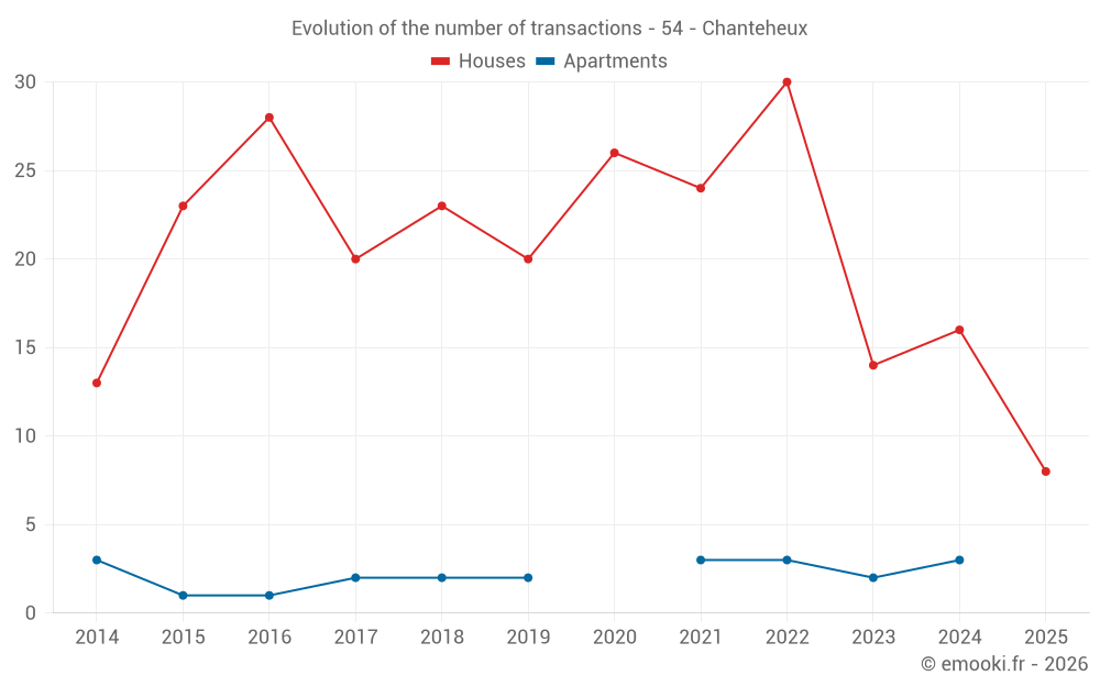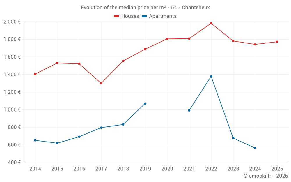 The median price on the 19 house transactions of the last 12 months in the municipality of Chanteheux was 1 780 € per square meter for a median property value of 210 000 €. Over this period, 60% of transactions were between 1 591 and 2 212 € per square meter (from the 2nd to the 8th deciles).