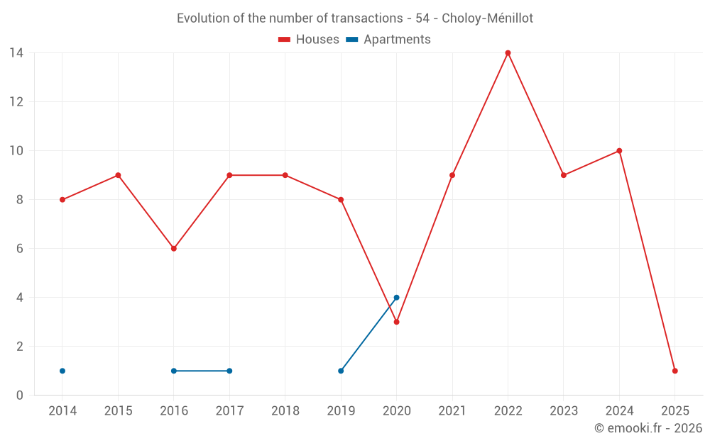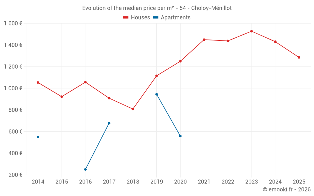 The median price on the 16 house transactions of the last 24 months in the municipality of Choloy-Ménillot was 1 512 € per square meter for a median property value of 136 500 €. Over this period, 60% of transactions were between 1 143 and 2 264 € per square meter (from the 2nd to the 8th deciles).