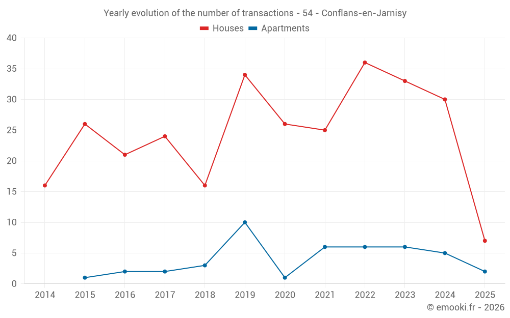 The median price on the 22 house transactions of the last 12 months in the municipality of Conflans-en-Jarnisy was 1 703 € per square meter for a median property value of 151 225 €. Over this period, 60% of transactions were between 1 117 and 2 127 € per square meter (from the 2nd to the 8th deciles).
