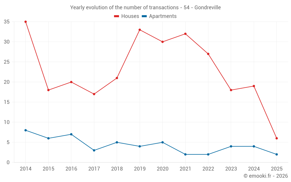 The median price on the 16 house transactions of the last 12 months in the municipality of Gondreville was 2 252 € per square meter for a median property value of 213 500 €. Over this period, 60% of transactions were between 1 124 and 2 946 € per square meter (from the 2nd to the 8th deciles).