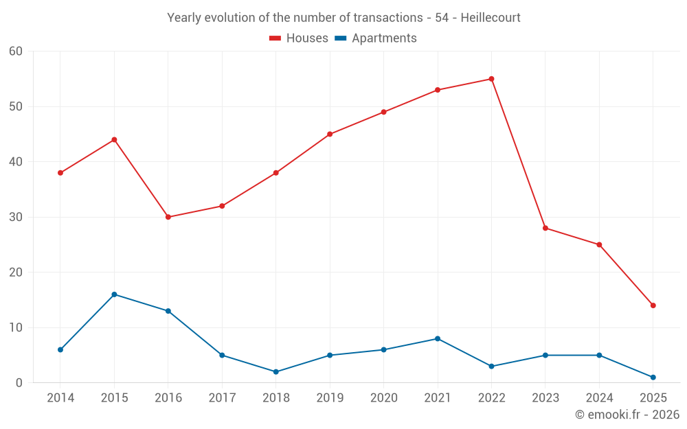 The median price on the 23 house transactions of the last 12 months in the municipality of Heillecourt was 2 532 € per square meter for a median property value of 258 770 €. Over this period, 60% of transactions were between 2 114 and 3 201 € per square meter (from the 2nd to the 8th deciles).
