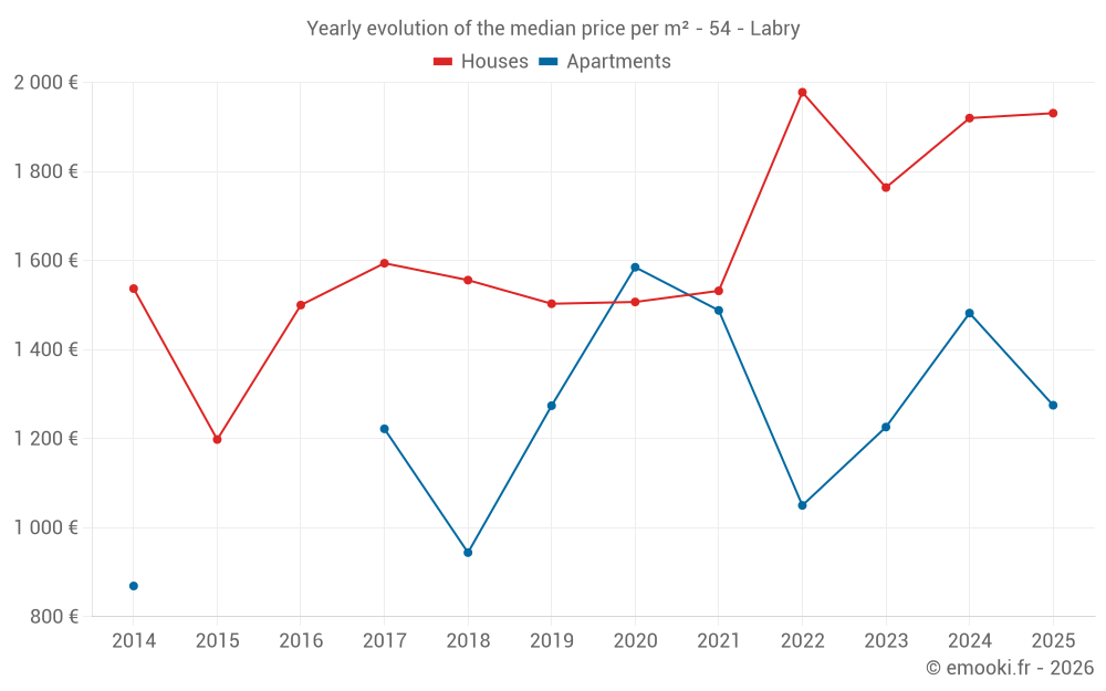 The median price on the 20 house transactions of the last 24 months in the municipality of Labry was 1 887 € per square meter for a median property value of 162 000 €. Over this period, 60% of transactions were between 1 616 and 2 463 € per square meter (from the 2nd to the 8th deciles).