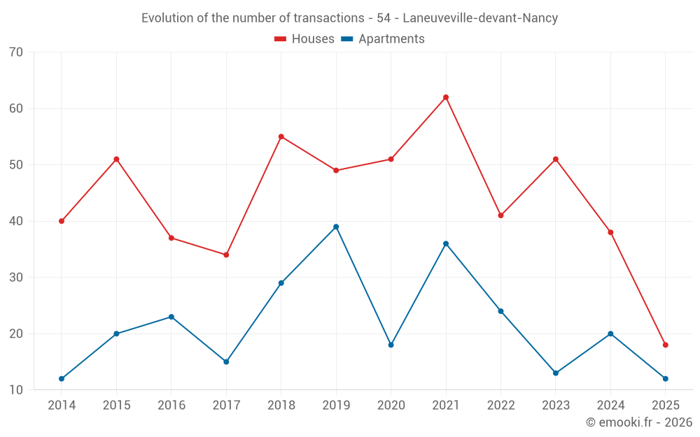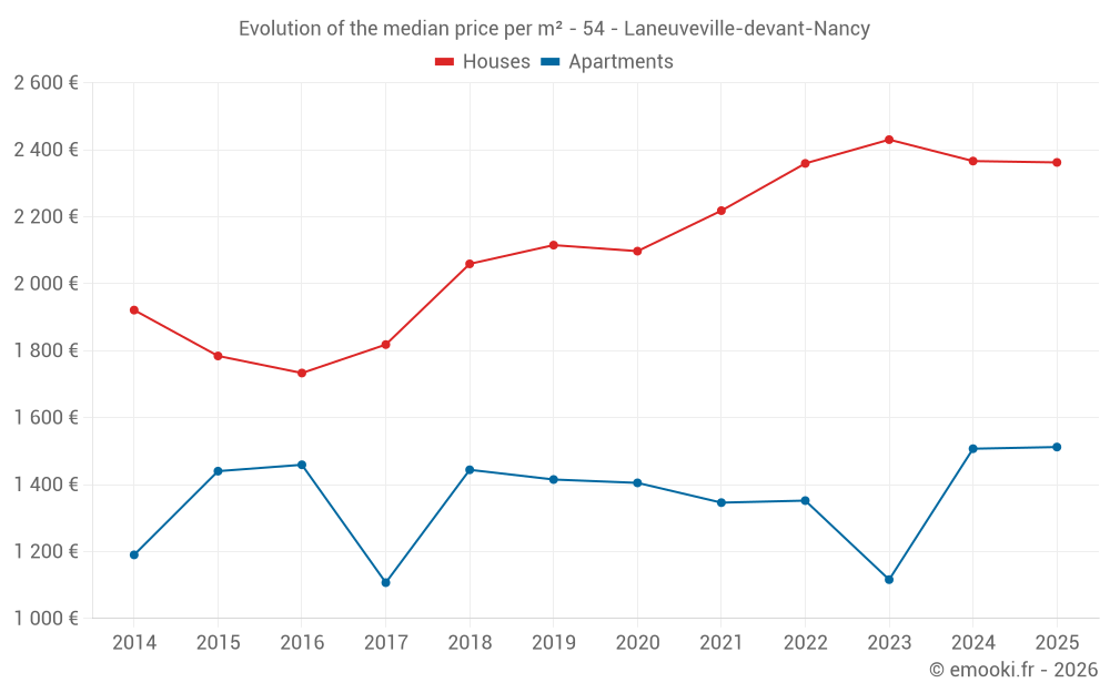 The median price on the 18 house transactions of the last 6 months in the municipality of Laneuveville-devant-Nancy was 2 362 € per square meter for a median property value of 228 500 €. Over this period, 60% of transactions were between 2 078 and 2 944 € per square meter (from the 2nd to the 8th deciles).