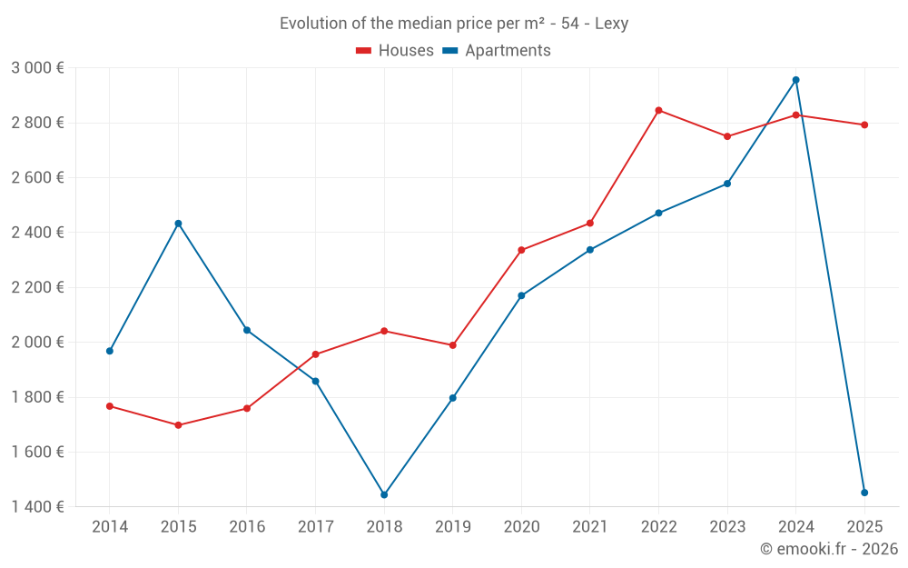 The median price on the 14 apartment transactions of the last 24 months in the municipality of Lexy was 2 641 € per square meter for a median property value of 193 900 €. Over this period, 60% of transactions were between 1 836 and 3 002 € per square meter (from the 2nd to the 8th deciles).