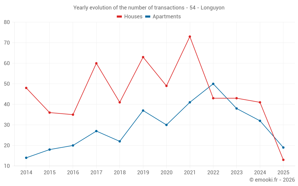The median price on the 19 apartment transactions of the last 6 months in the municipality of Longuyon was 958 € per square meter for a median property value of 69 000 €. Over this period, 60% of transactions were between 663 and 1 178 € per square meter (from the 2nd to the 8th deciles).