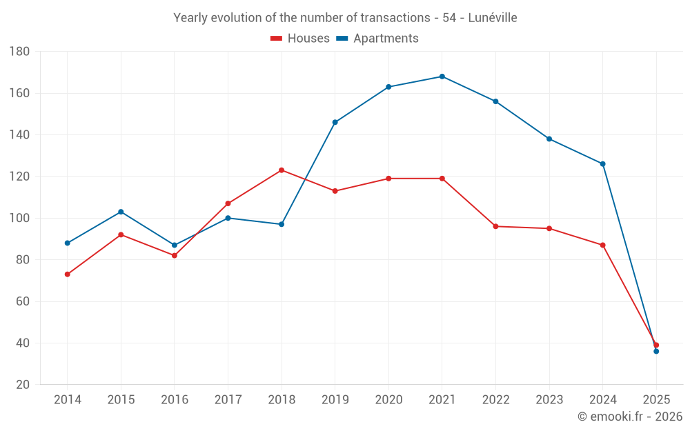 The median price on the 39 house transactions of the last 6 months in the municipality of Lunéville was 1 672 € per square meter for a median property value of 165 000 €. Over this period, 60% of transactions were between 1 071 and 2 369 € per square meter (from the 2nd to the 8th deciles).
