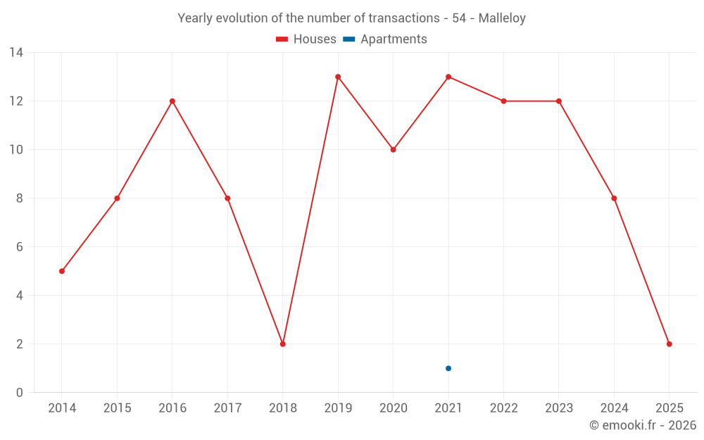 The median price on the 18 house transactions of the last 24 months in the municipality of Malleloy was 1 928 € per square meter for a median property value of 198 000 €. Over this period, 60% of transactions were between 1 399 and 2 449 € per square meter (from the 2nd to the 8th deciles).