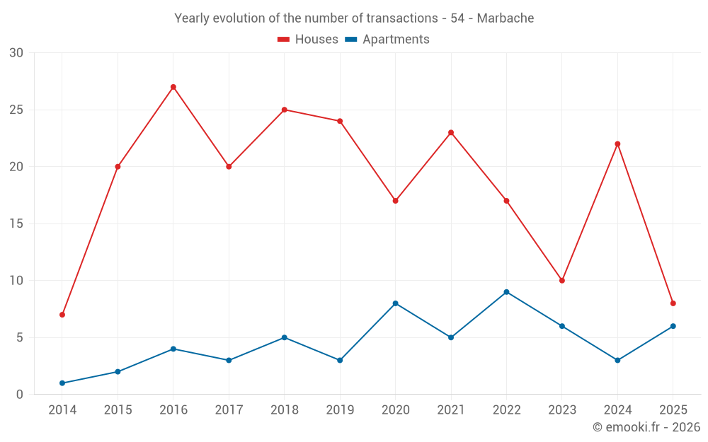 The median price on the 25 house transactions of the last 12 months in the municipality of Marbache was 1 869 € per square meter for a median property value of 166 250 €. Over this period, 60% of transactions were between 1 197 and 2 333 € per square meter (from the 2nd to the 8th deciles).