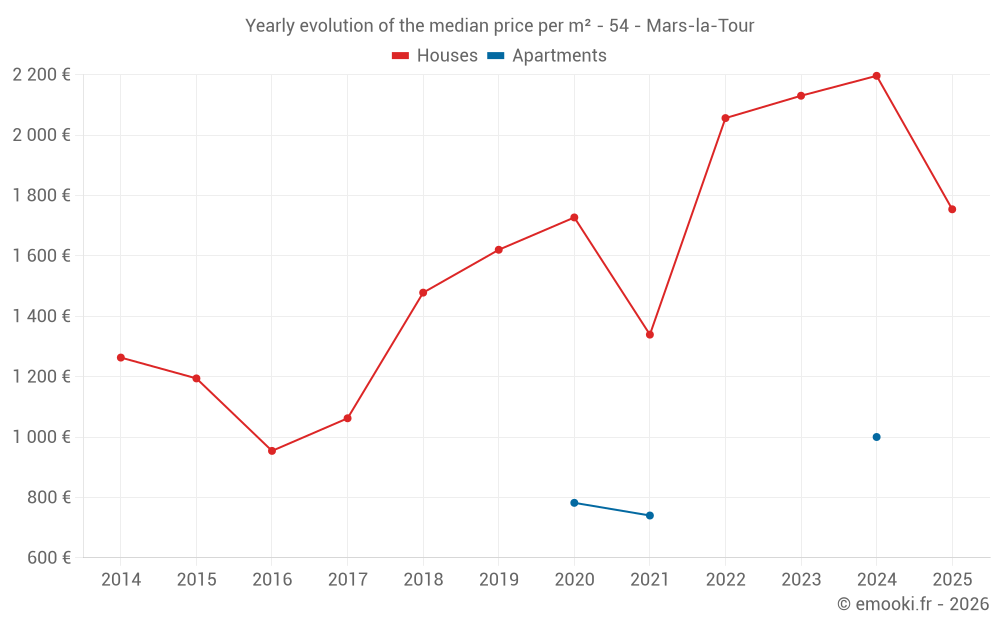 The median price on the 17 house transactions of the last 24 months in the municipality of Mars-la-Tour was 1 824 € per square meter for a median property value of 210 000 €. Over this period, 60% of transactions were between 1 414 and 2 367 € per square meter (from the 2nd to the 8th deciles).