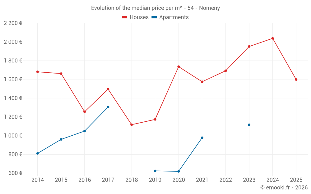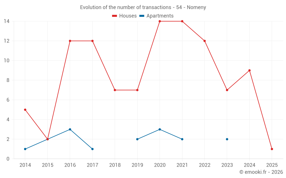 The median price on the 14 house transactions of the last 24 months in the municipality of Nomeny was 2 013 € per square meter for a median property value of 218 175 €. Over this period, 60% of transactions were between 1 535 and 2 387 € per square meter (from the 2nd to the 8th deciles).