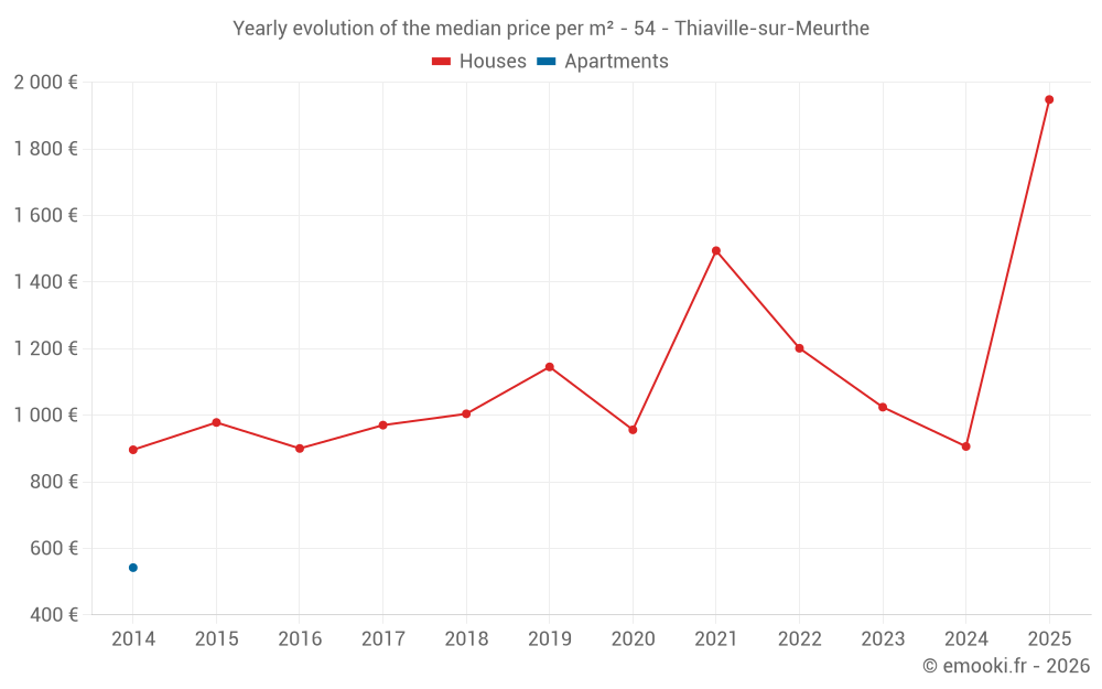 The median price on the 16 house transactions of the last 24 months in the municipality of Thiaville-sur-Meurthe was 1 271 € per square meter for a median property value of 133 450 €. Over this period, 60% of transactions were between 853 and 1 813 € per square meter (from the 2nd to the 8th deciles).