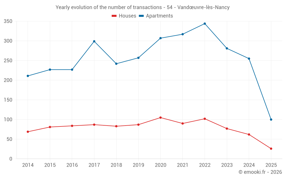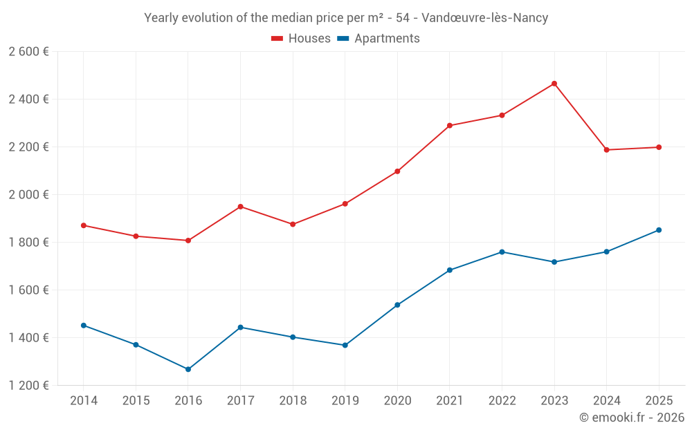 The median price on the 26 house transactions of the last 6 months in the municipality of Vandœuvre-lès-Nancy was 2 199 € per square meter for a median property value of 187 000 €. Over this period, 60% of transactions were between 1 494 and 3 092 € per square meter (from the 2nd to the 8th deciles).